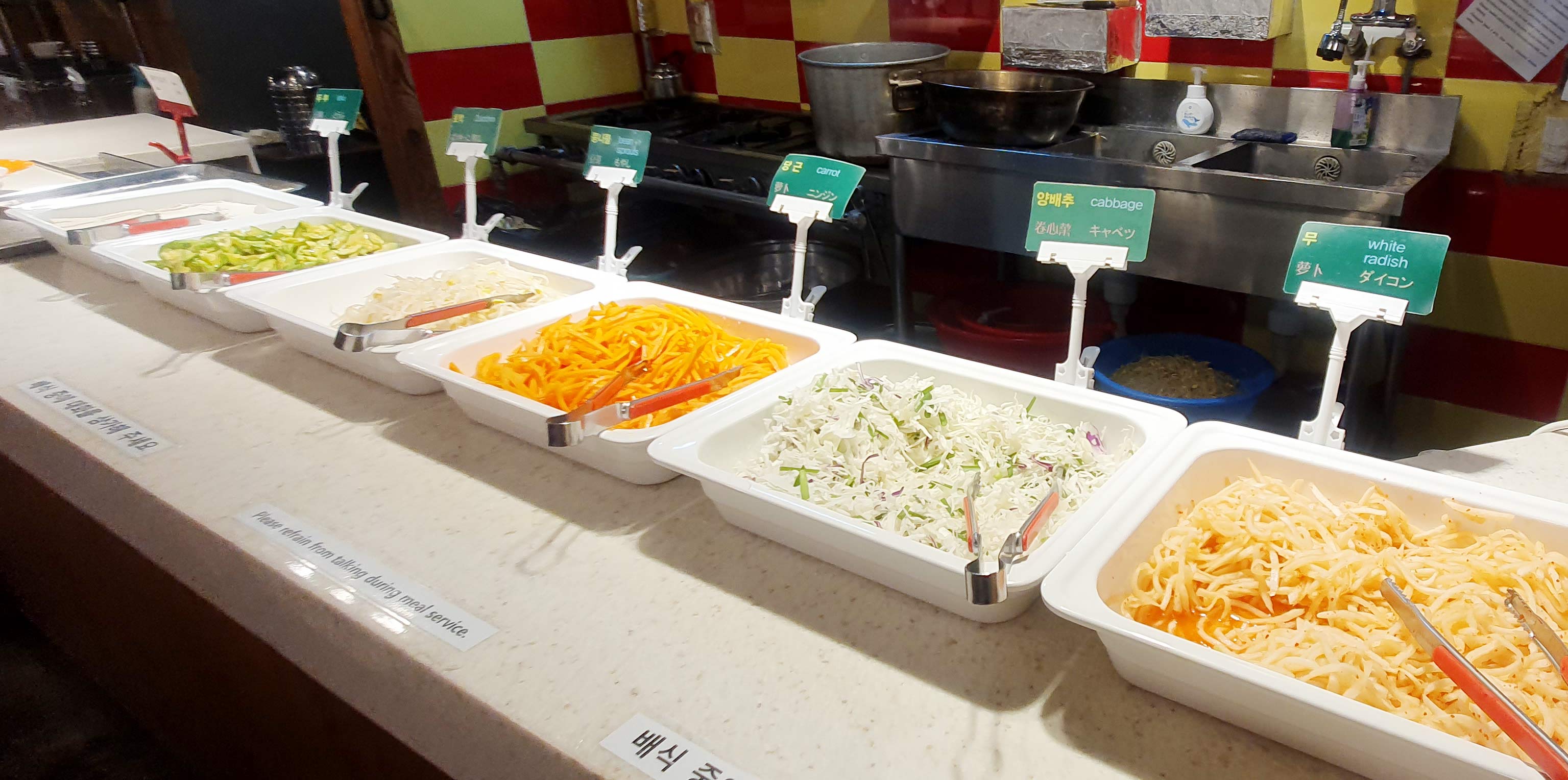비비밥 그릇하나 집어들고 대형밥솥 열어 먹을 만큼 밥을 담고 생채나물, 양배추, 당근, 콩나물, 호박볶음, 다진 돼지고기 등을 얹어 강된장, 매콤한맛 소스, 달콤한맛 소스 중 원하는 소스를 알맞게 담는다. 계란후라이도 원하는 만큼 담을 수 있다는걸 알았을때 행복감이 증폭한다. 간장소스도 있어서 간장베이스 콩나물밥 스타일을 좋아하시는 분들도 야무지게 먹을 수 있다. 참깨와 참기름 휘휘둘러 반찬 김치와 단무지를 챙긴뒤 오이냉국(겨울에는 된장국) 담아 자리로 와서 비빈다.