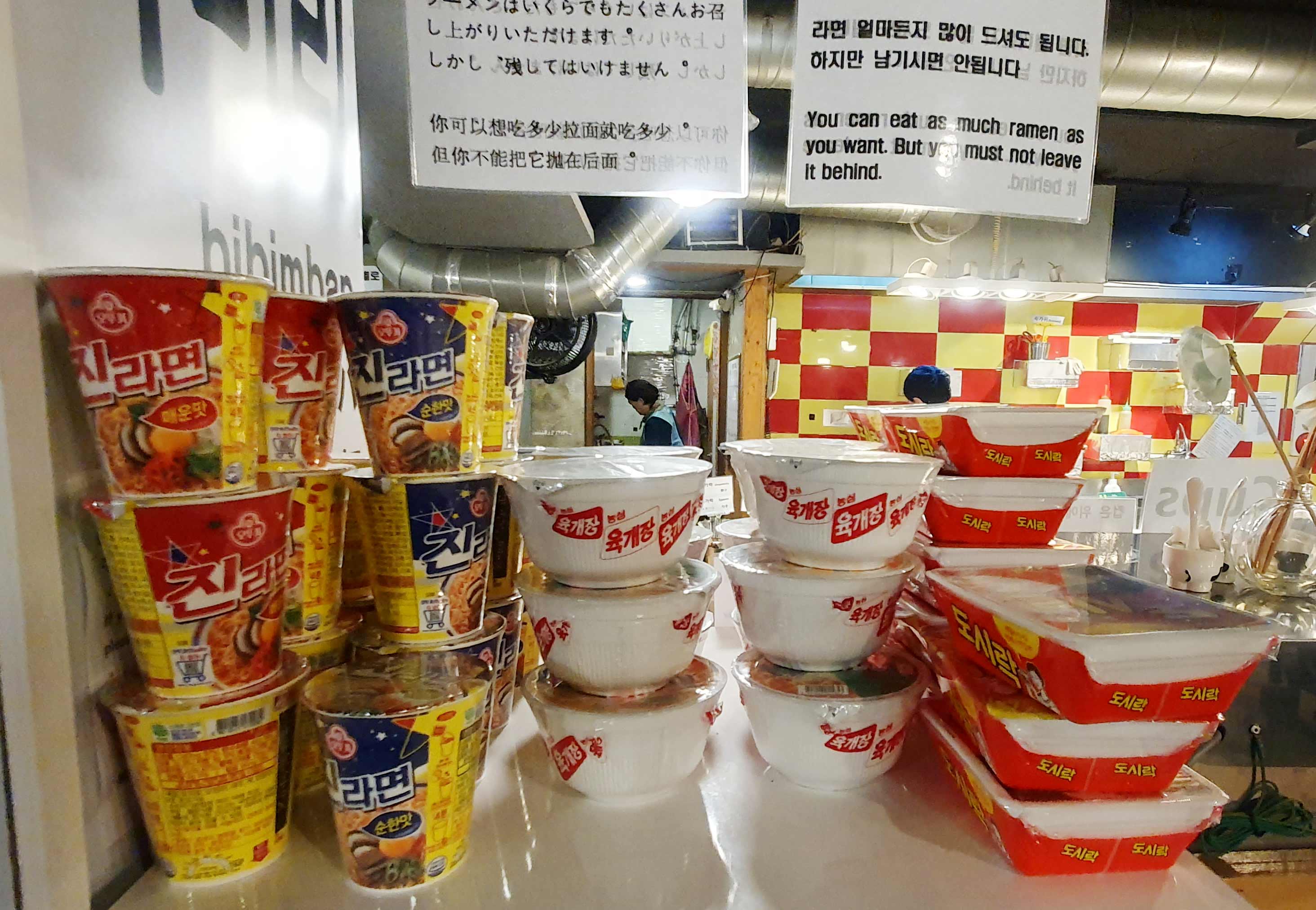 비빔밥을 두번 먹으면 배가 불러 컵라면을 먹을 수 있을까란 생각을 하겠지만, 비비밥과 컵라면 국물의 조화는 말할 필요없이 맛있다는것을 우리는 이미 알고 있다.진라면 순한맛/매운맛, 농심 육개장 사발면, 팔도 도시락 등 라면계의 스타들이 다 모여있다. 남기지만 않으면 된다는 문구만 잘 기억해주시면 좋겠다. 큰사발이 아니고 소컵이라 부담이 덜하니 본인의 양만큼 먹으면 되겠다.